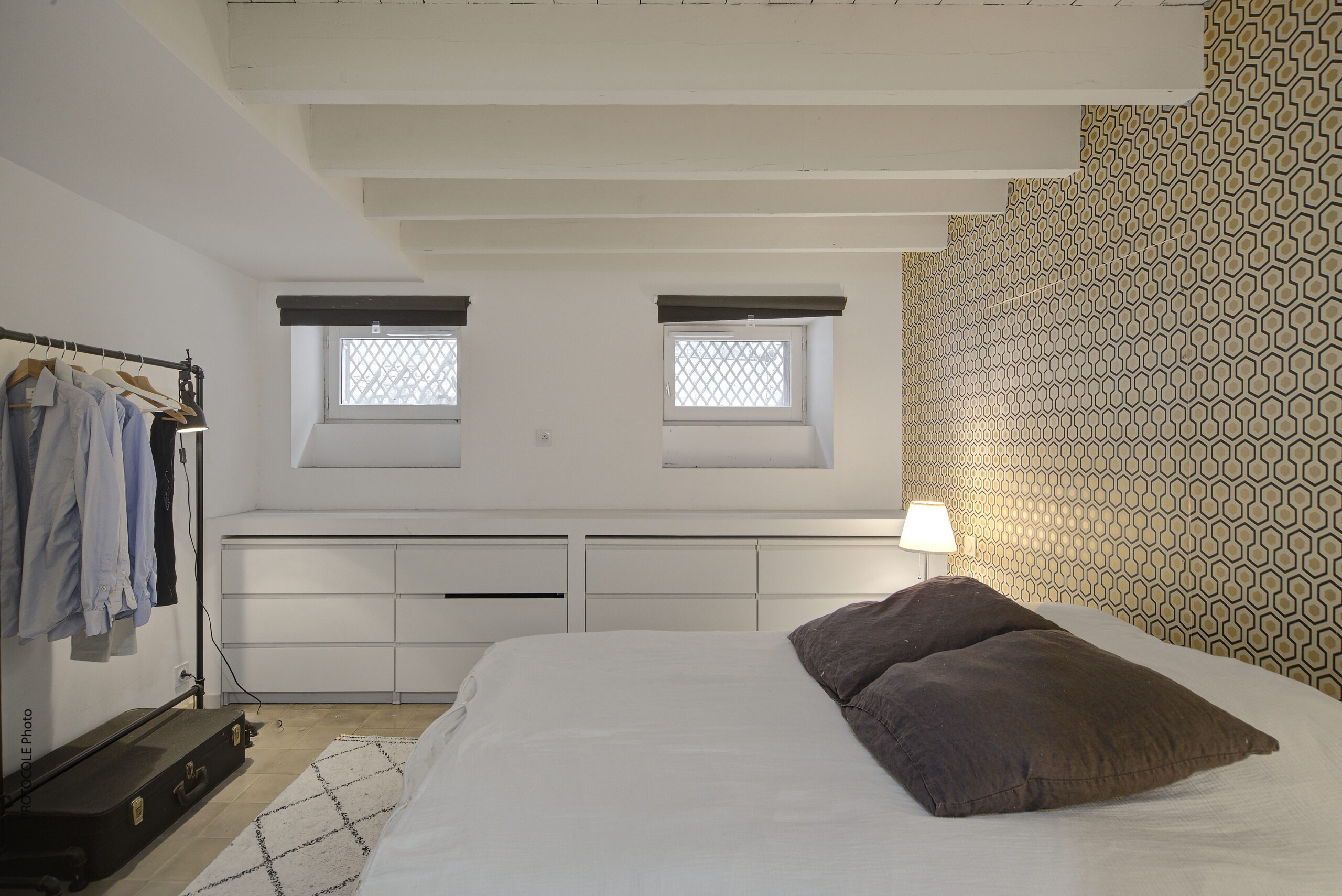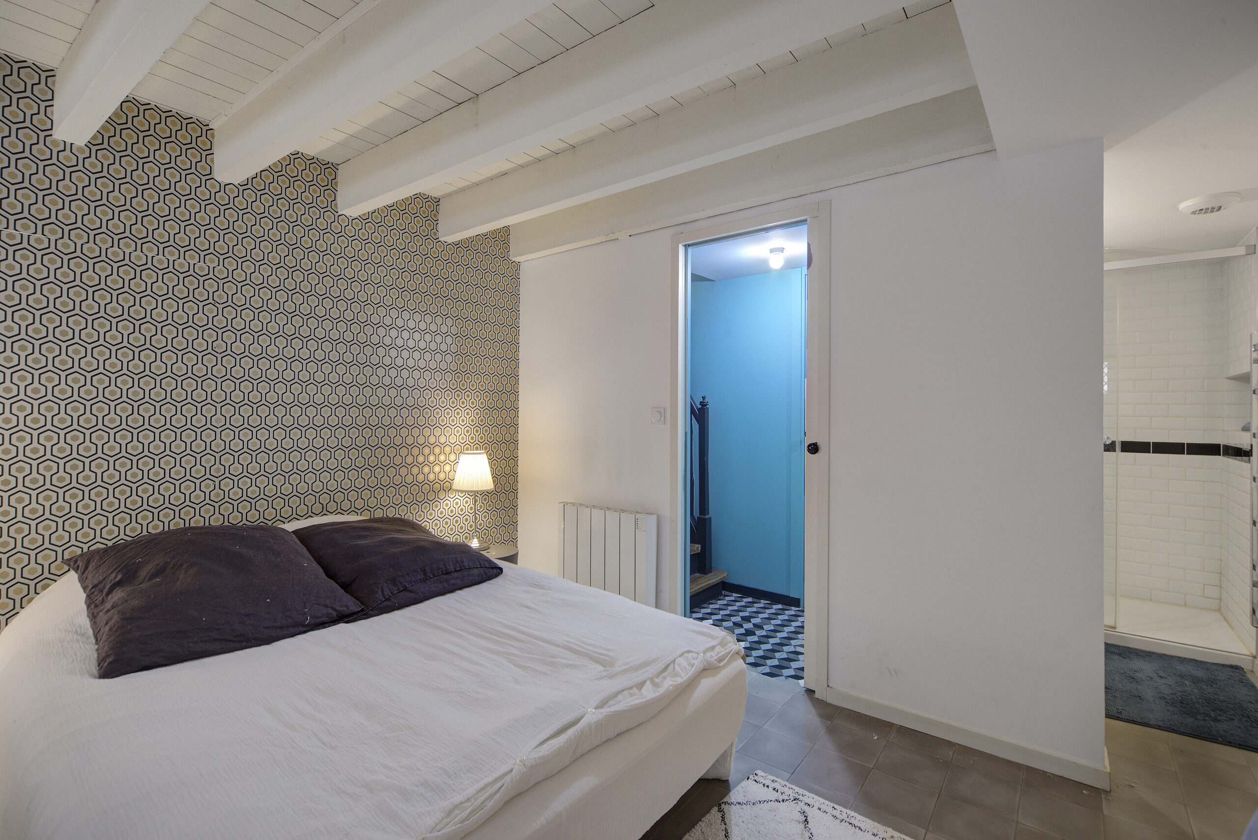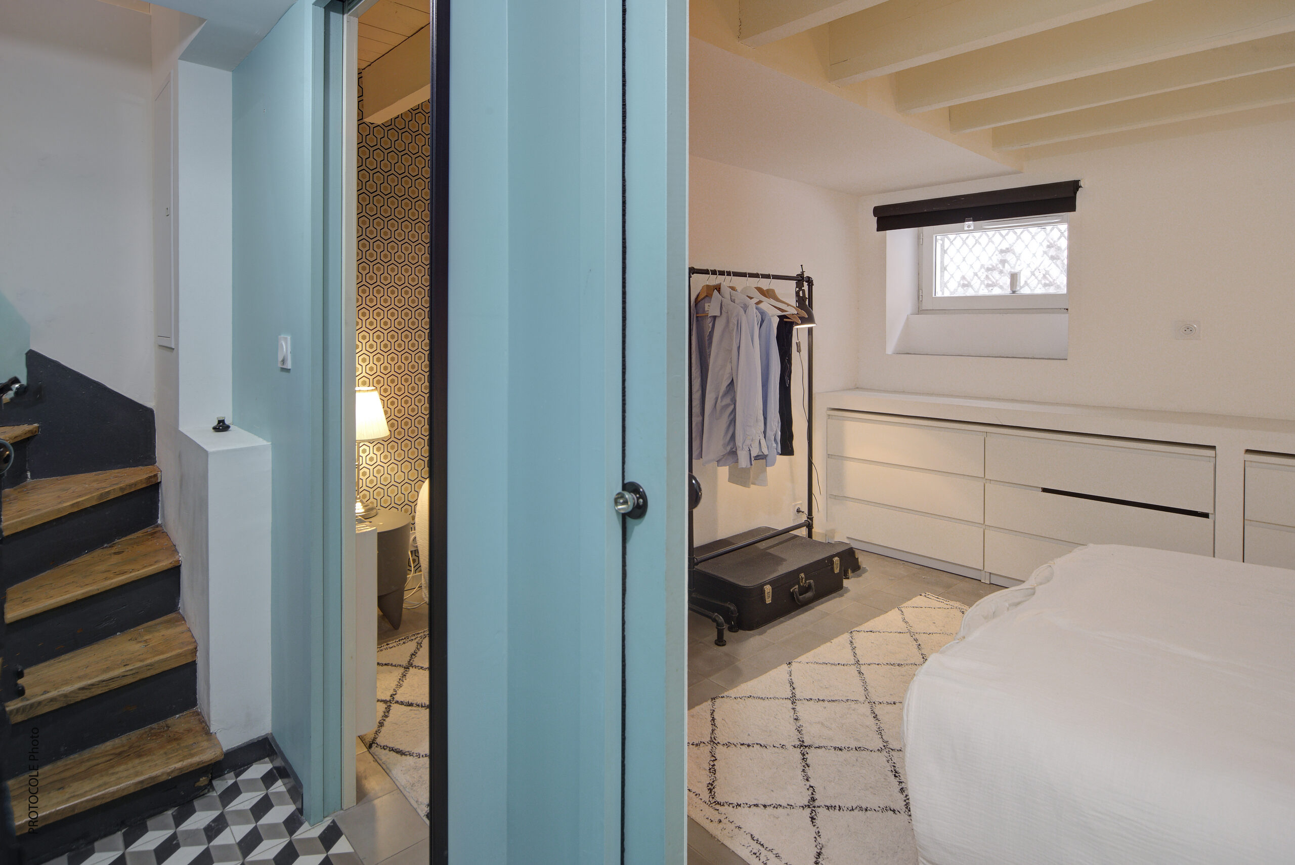 À l’entresol de ce duplex : une chambre avec sa salle d’eau et un WC séparés.